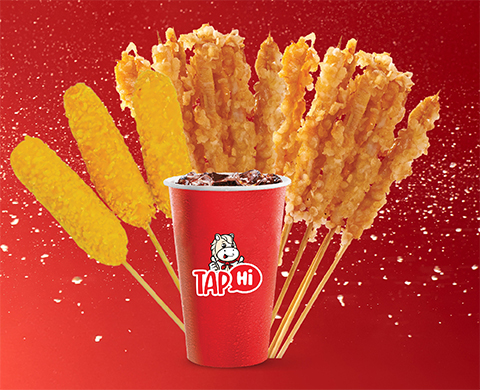 3 xiên gà hoa tuyết trắng + 3 xiên gà hoa tuyết vàng + 4 xiên cá tẩm bột + 1 nước
